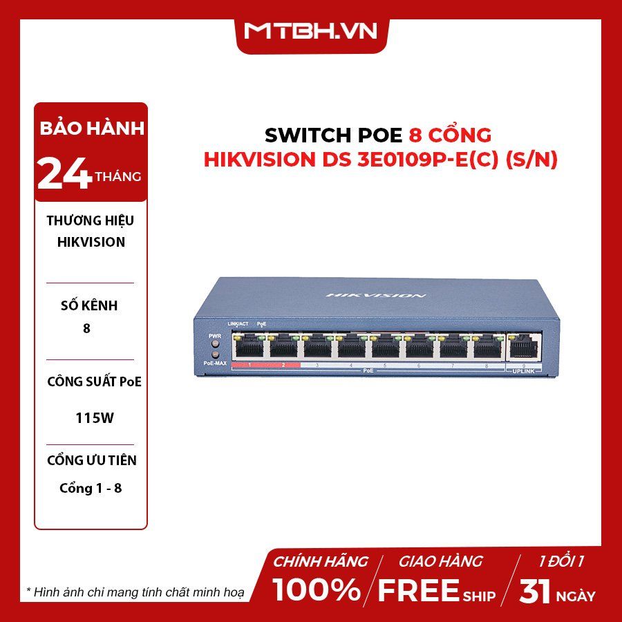 - Switch mạng Layer 2, 8 cổng PoE 100M, 1 cổng uplink 10/100M.