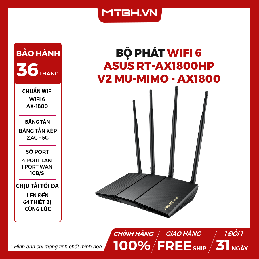Router Asus RT-AX1800HP v2 thiết kế theo tiêu chuẩn WiFi 6, hỗ trợ công nghệ MU-MIMO và OFDMA mang lại hiệu quả và lưu lượng tốt hơn.