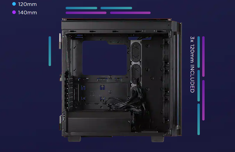 ![]() | Tăng cường khả năng làm mát Nội thất chứa tối đa 6 x Fan 120mm hoặc 4 x Fan 140mm hoặc nhiều bộ tản nhiệt với kích thước lên đến 360mm. |