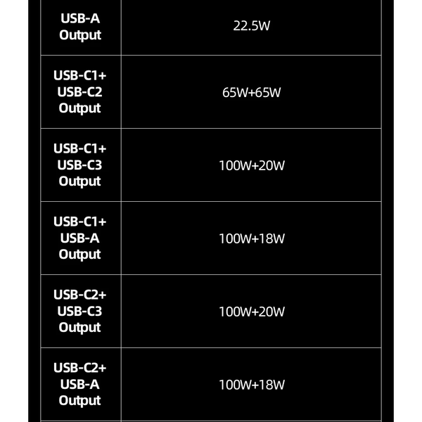 - USB-A Output: 5V⎓3A; 4.5V⎓5A; 5V⎓4.5A; 9V⎓2A; 12V⎓1.5A (22.5W Max)