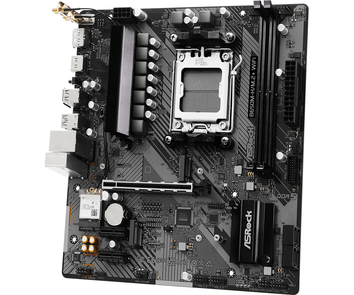 ASRock B650M-H/M2+ WiFi tương thích hoàn toàn với socket AM5 và các dòng CPU AMD Ryzen mới nhất. Với cấu trúc cấp điện 6+1+1 và MOSFET Dr.MOS mạnh mẽ, bo mạch đảm bảo nguồn điện ổn định cho CPU hoạt động ở hiệu suất cao mà vẫn giữ được độ bền tối đa.