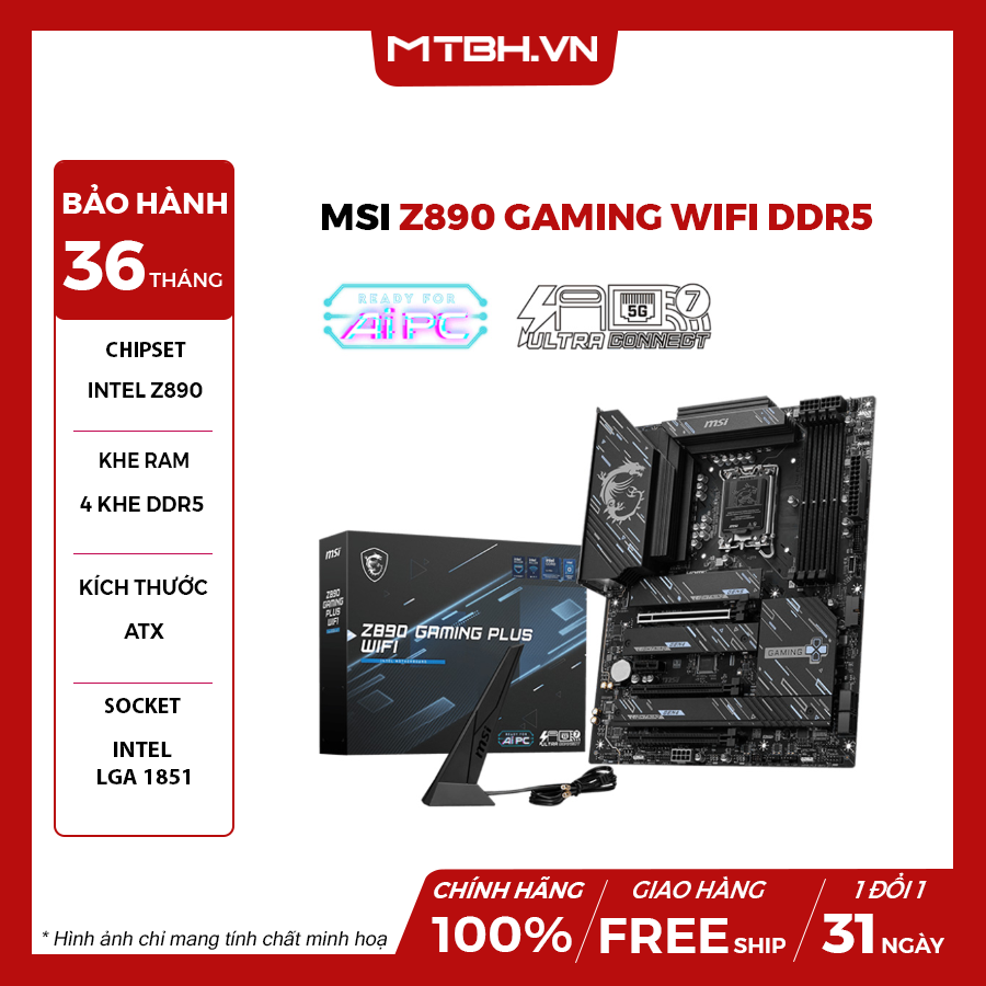 MSI Z890 GAMING PLUS WIFI DDR5 là bo mạch chủ ATX được thiết kế để mang lại trải nghiệm gaming đỉnh cao với các linh kiện bền bỉ và hiệu năng mạnh mẽ. Tích hợp những công nghệ tiên tiến như Killer Wi-Fi 7, LAN 5G, Thunderbolt 4, và PCIe 5.0, Mainboard MSI này sẵn sàng đáp ứng mọi nhu cầu từ game thủ chuyên nghiệp đến người dùng yêu cầu cao về tốc độ và độ ổn định.