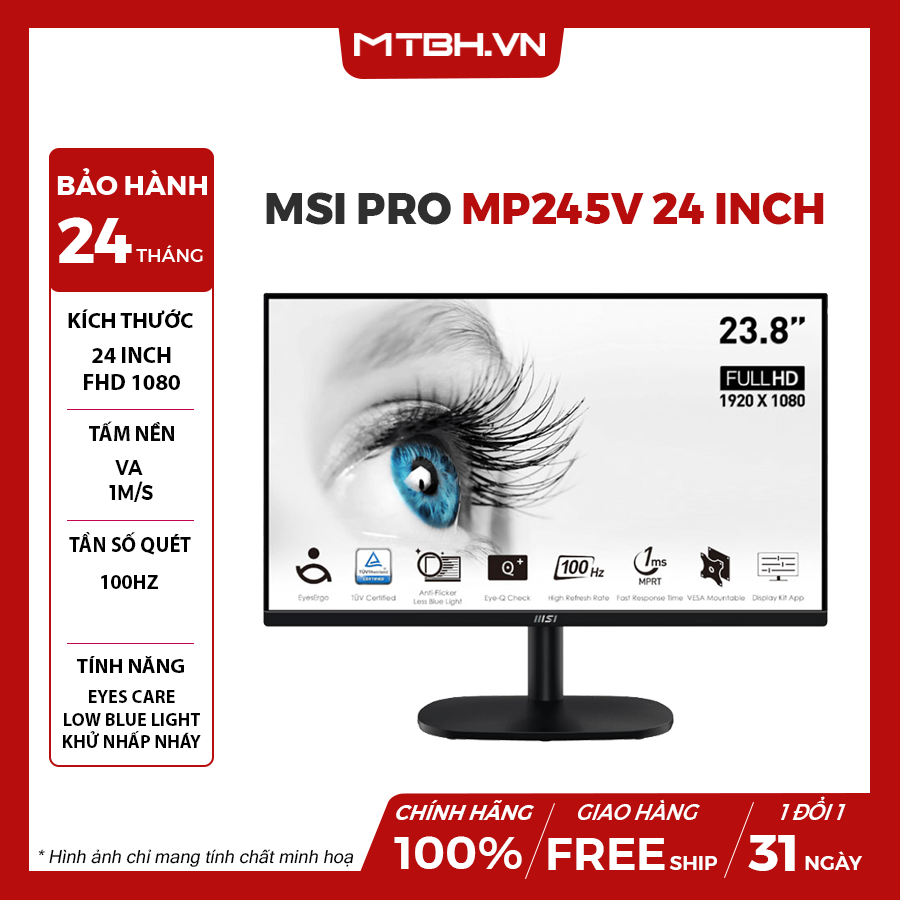 MSI là thương hiệu màn hình máy tính nổi tiếng toàn cầu với rất nhiều sản phẩm chất lượng cao cùng mức giá hợp lý. Trong đó, màn hình MSI PRO MP245V - Chính hãng là lựa chọn thích hợp cho người dùng học sinh, sinh viên hoặc làm việc văn phòng, giải trí cơ bản. Màn hình sở hữu những thông số nổi bật như kích thước 23.8 inch, độ phân giải 19020x1080 pixel, tần số quét 100Hz, thời gian phản hồi 1ms, độ sáng 300 nit cùng chứng nhận TÜV bảo vệ mắt, chức năng Eye-Q check thông minh.