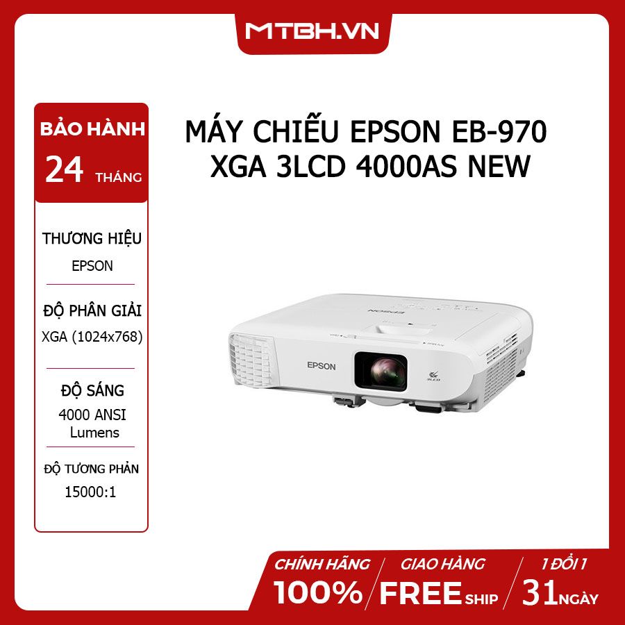 Máy chiếu Epson EB-970 có độ sáng tương đối cao 4000 Ansi Lumens độ tương phản 15000:1 độ phân giải XGA (1024x768) được giới văn phòng ưa chuộng vì khả năng trình chiếu trên màn hình rộng ngay cả khi phòng sáng và độ tương phản cao, đô phân giải XGA cũng mang lại ưu điểm trình chiếu các file văn bản to và rõ ràng dễ đọc.