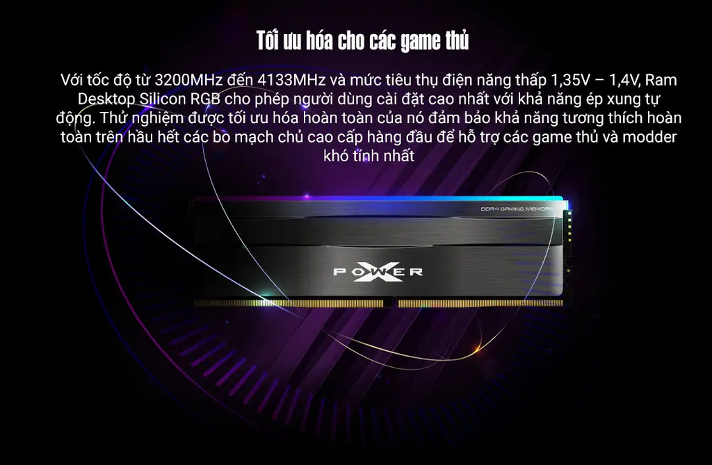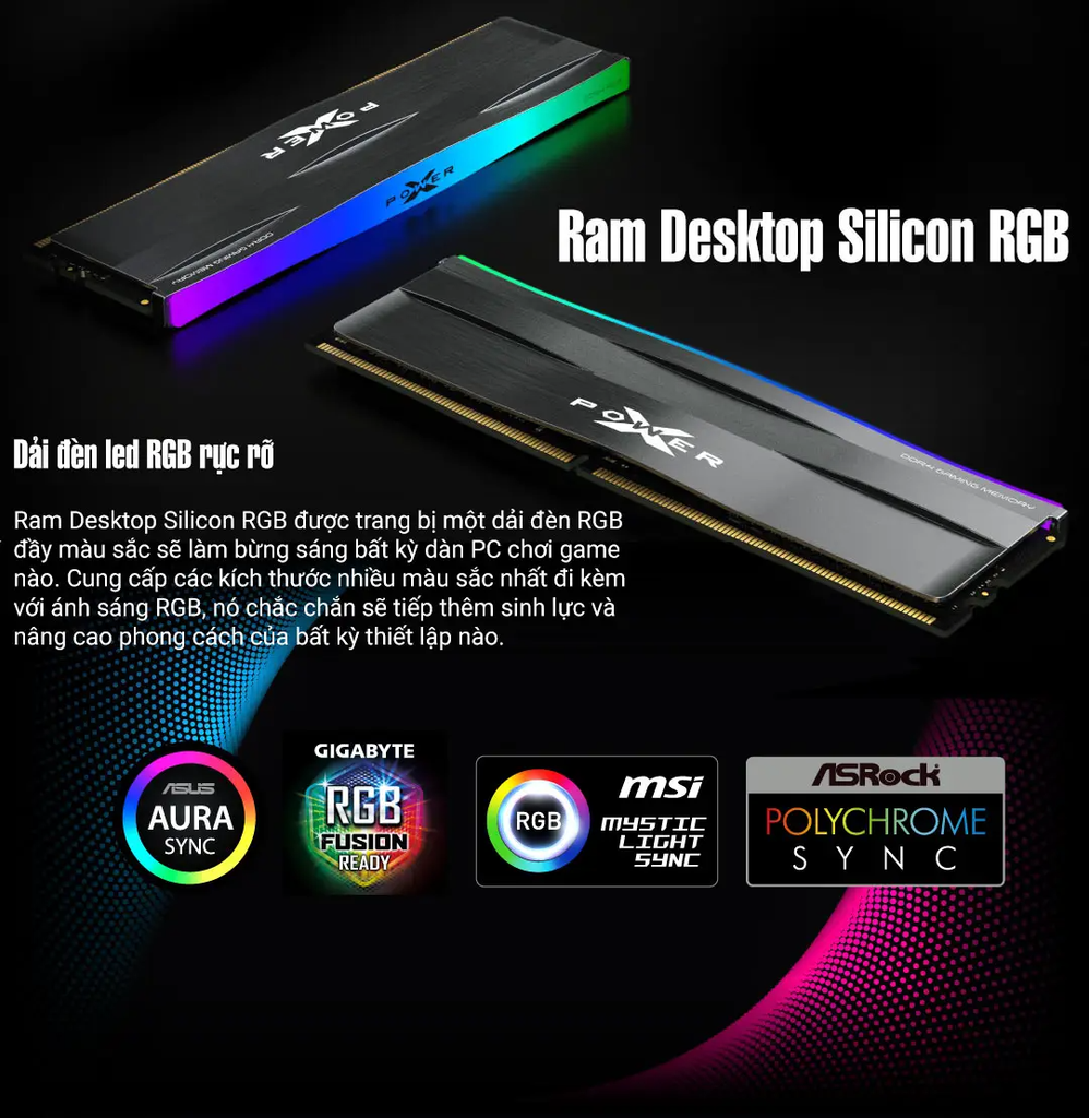 Ram Desktop Silicon RGB được là sản phẩm phù hợp với mọi người dùng máy tính, từ các game thủ cho đến các modder. Gồm nhiều phiên bản bus ram và dung lượng để lựa chọn. Dải đèn led RGB cực kì bắt mắt, tương thích với các phần mềm đồng hộ hiện nay của bo mạch chủ như ASUS, MSI, ASROCK, GIGABYTE...