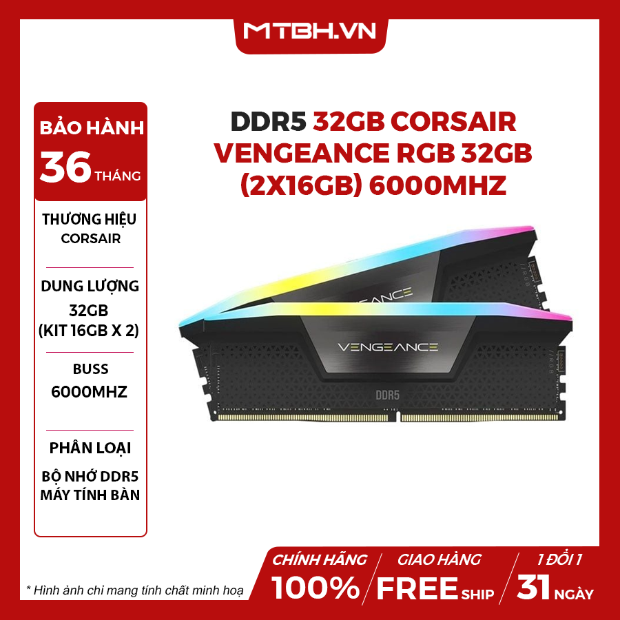 Corsair Vengeance RGB 32GB (2x16GB) DDR5-6000MHz là dòng RAM cao cấp dành cho những game thủ và người dùng chuyên nghiệp, mang đến hiệu năng đỉnh cao, phong cách ấn tượng và sự độc đáo. Với tốc độ 6000MHz, dung lượng 32GB và hiệu ứng RGB rực rỡ, sản phẩm này là lựa chọn hoàn hảo cho những ai muốn nâng cấp hệ thống máy tính của mình lên một tầm cao mới.