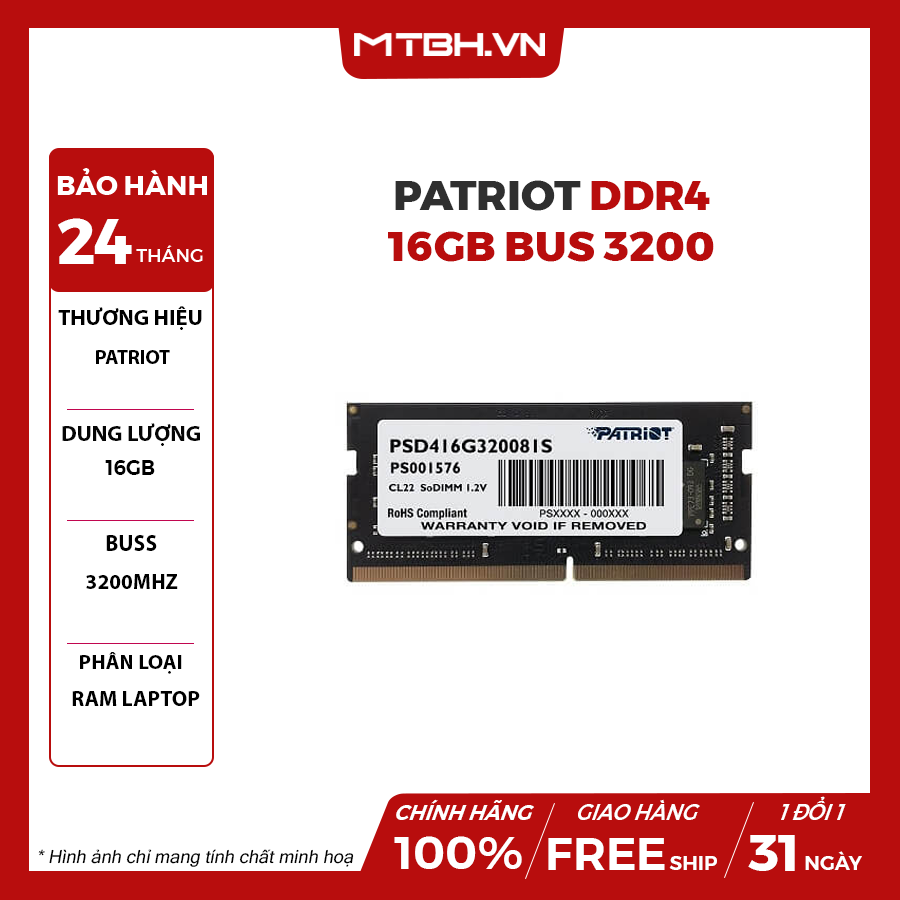 Patriot là một thương hiệu chuyên sản xuất các sản phẩm bộ nhớ máy tính từ rất lâu đời. Bên cạnh các thiết bị ổ cứng máy tính thì hãng sản xuất này còn lấn sân sang lĩnh vực RAM laptop. Ngày hôm nay, mời các bạn hãy cùng mình tìm hiểu dòng RAM Laptop DDR4 Patriot 16GB Bus 3200 SODIMM PSD416G320081S mới vừa được ra mắt trong thời gian gần đây nhé.