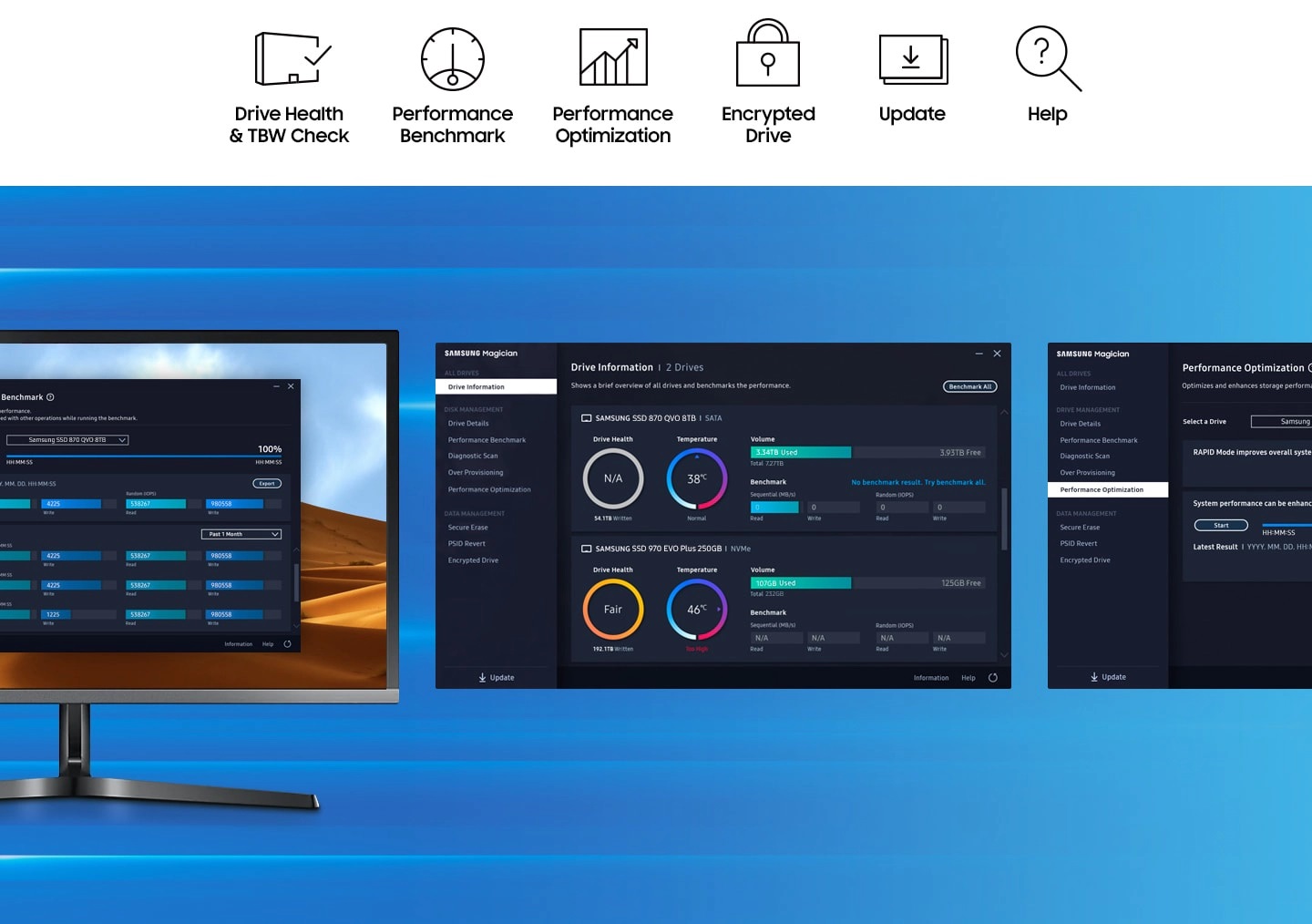 ![]() | Samsung Magician - Phần mềm quản lý và tăng tốc cho ổ cứng Samsung Ổ cứng SSD Samsung 870 QVO được đi kèm phần mềm Samsung Magician cho phép bạn thiết lập, tối ưu hóa và quản lý hệ thống của bạn, tăng tốc cho hiệu suất SSD cực cao. |