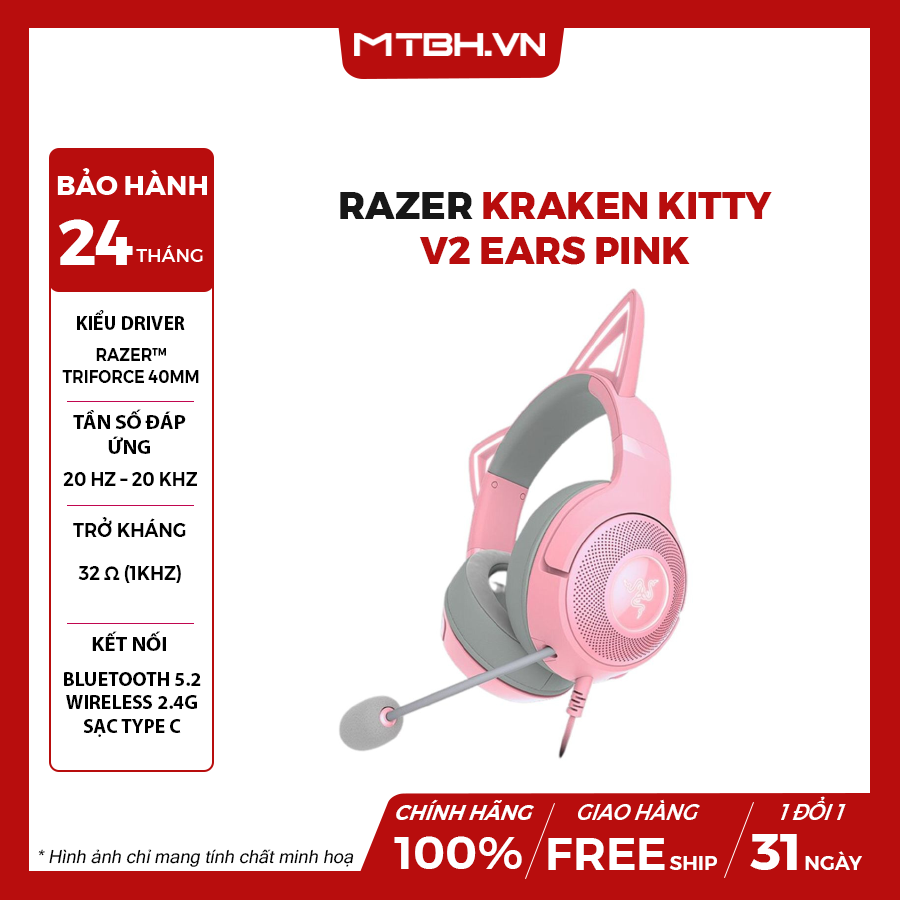 Không thể nhắc đến một sản phẩm Razer mà không nhắc đến Razer Chroma RGB. Kraken Kitty V2 BT được trang bị hệ thống đèn RGB sống động với 16.8 triệu màu và vô số hiệu ứng ánh sáng động. Đôi tai mèo và logo Razer phát sáng rực rỡ, cho phép bạn cá nhân hóa tai nghe theo phong cách riêng của mình, đồng bộ hóa với các thiết bị Razer Chroma khác để tạo nên một không gian gaming tràn ngập ánh sáng và màu sắc.