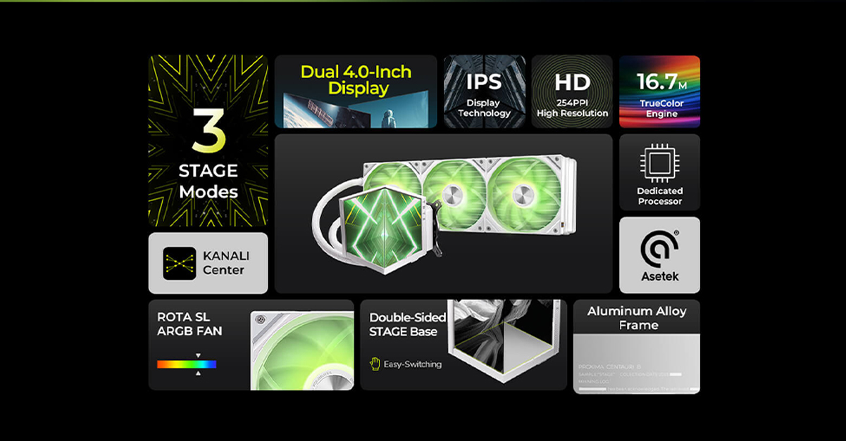 TRYX PANORAMA STAGE ARGB 360 được trang bị 2 màn hình LCD IPS kích thước 4.0 inch, độ phân giải 720 x 720 mỗi màn hình, hiển thị sắc nét với 16.7 triệu màu. Người dùng có thể tùy chỉnh hiển thị nhiệt độ CPU, thông số hệ thống, hình ảnh hoặc animation, biến dàn PC trở nên nổi bật và cá tính hơn.