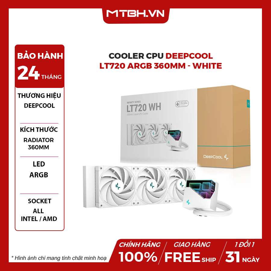 Bộ làm mát CPU chất lỏng hiệu suất cao DeepCool LT720 cung cấp khả năng tản nhiệt mạnh mẽ với bộ tản nhiệt 360mm, ba quạt FK120 được điều chỉnh chính xác và nắp trên gương vô cực đa chiều.