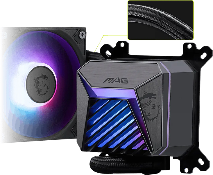 MSI trang bị quạt CycloBlade 9 với thiết kế cánh quạt lai, mang lại luồng gió mạnh mẽ và áp suất tĩnh cao, đồng thời giảm tiếng ồn xuống mức dễ chịu. Quạt ARGB được lắp đặt sẵn, tích hợp đầu nối dây dạng chuỗi ẩn, giúp giấu gọn dây cáp và tạo sự liền mạch cho tổng thể hệ thống.