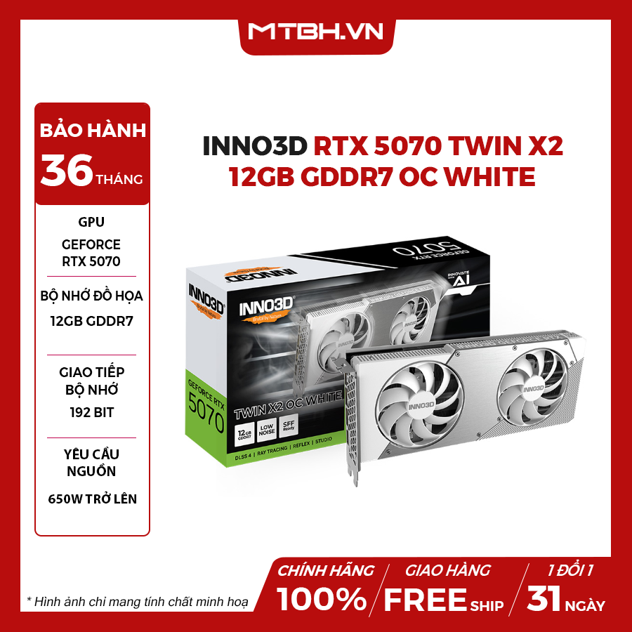 VGA Inno3D GeForce RTX 5070 TWIN X2 OC WHITE 12GB GDDR7 là một trong những sản phẩm mới nhất thuộc dòng card đồ họa RTX 50 Series của NVIDIA. Với hiệu năng mạnh mẽ, thiết kế hiện đại và khả năng xử lý đồ họa vượt trội, đây là sự lựa chọn hoàn hảo dành cho game thủ và những người làm công việc sáng tạo nội dung chuyên nghiệp.