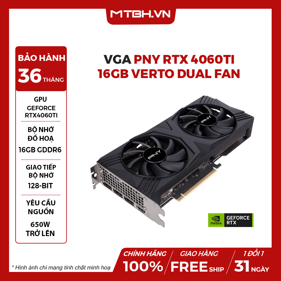 PNY GeForce RTX 4060 Ti 16GB VERTO Dual Fan là lựa chọn hoàn hảo cho những ai đang tìm kiếm một card đồ họa mạnh mẽ, bền bỉ và ổn định. Với sức mạnh từ kiến trúc NVIDIA Ada Lovelace, dung lượng VRAM lớn và khả năng làm mát hiệu quả, sản phẩm này mang đến trải nghiệm chơi game tuyệt vời và khả năng xử lý đồ họa chuyên nghiệp. Được thiết kế dành riêng cho game thủ và nhà sáng tạo nội dung, RTX 4060 Ti sẽ giúp bạn thỏa sức khám phá các tựa game và dự án sáng tạo với hiệu năng hàng đầu.