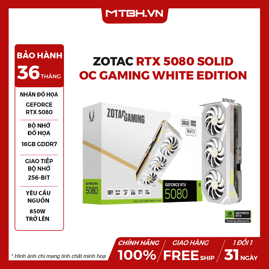 ZOTAC GAMING GeForce RTX 5080 SOLID OC White Edition là lựa chọn lý tưởng cho những ai tìm kiếm hiệu suất cao và công nghệ đồ họa tiên tiến trong một thiết kế tinh tế và hiện đại.